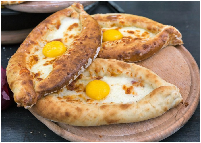 Adjarian khachapuri is a boat-shaped bread filled with cheese, butter, and a sunny egg yolk in the center. This iconic dish from the Adjara Region represents the area’s coastal location and sunny climate. Typically eaten by breaking off pieces of the bread and dipping them into the cheese and egg mixture, Adjarian khachapuri is both delicious and filling. Its distinctive shape and rich flavors make it a must-try for anyone visiting Georgia, offering a unique and satisfying culinary experience.